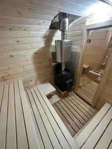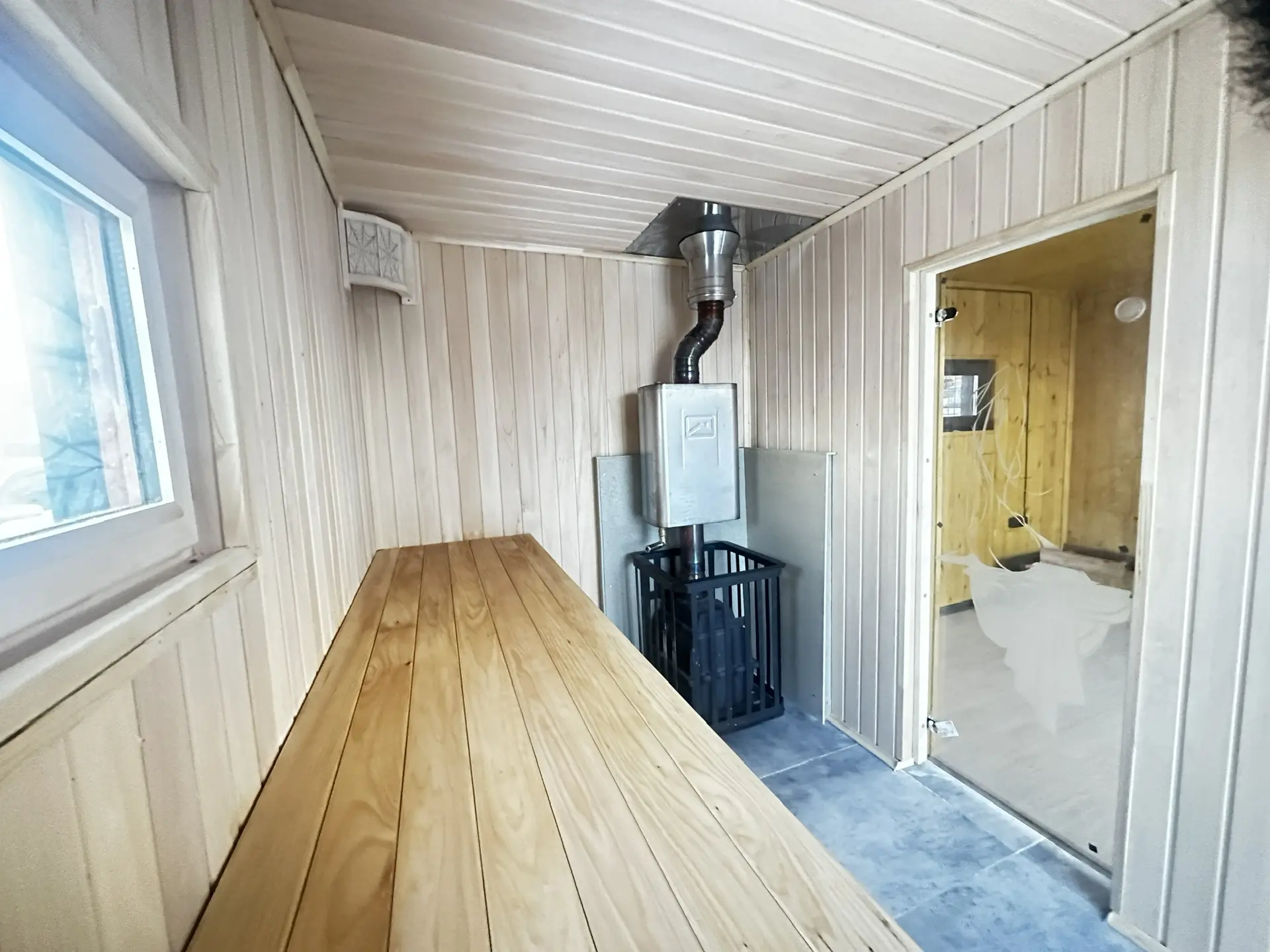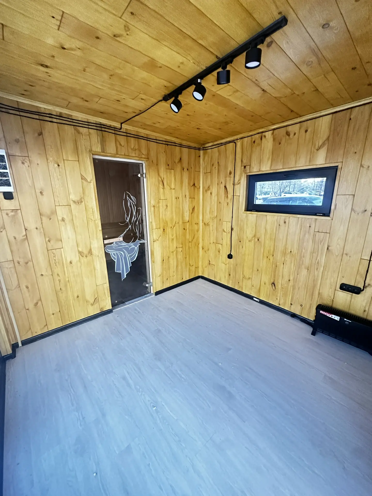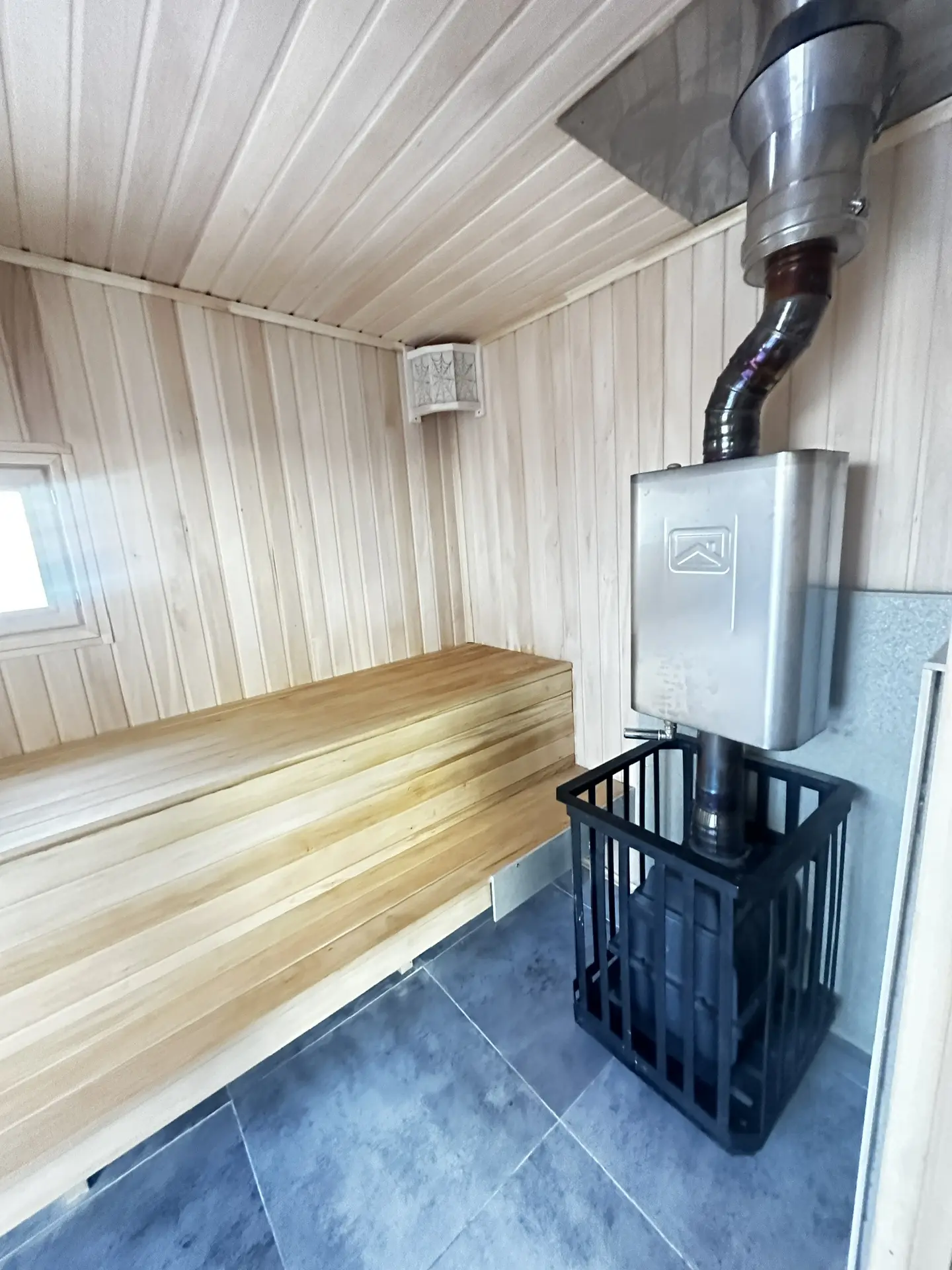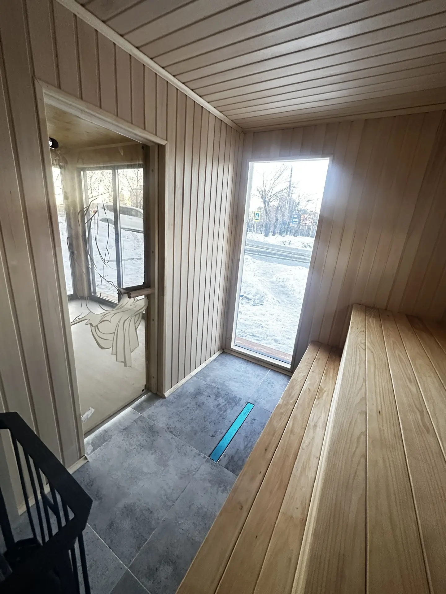 Парная и душевая выполнены с полом из керамогранита со сливом — это удобно в эксплуатации, легко мыть и гигиенично. Печь можно установить с выносом топки как внутрь, так и наружу — выбирайте вариант, который удобнее под ваш участок и сценарий использования.