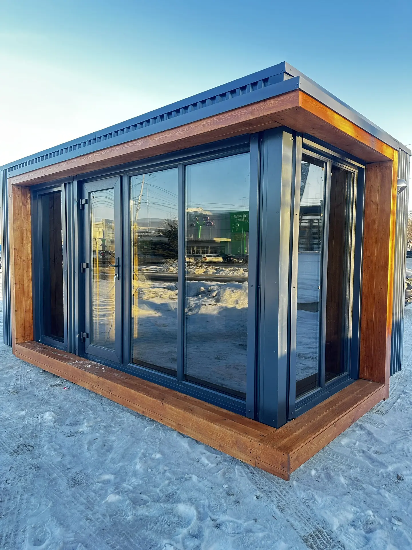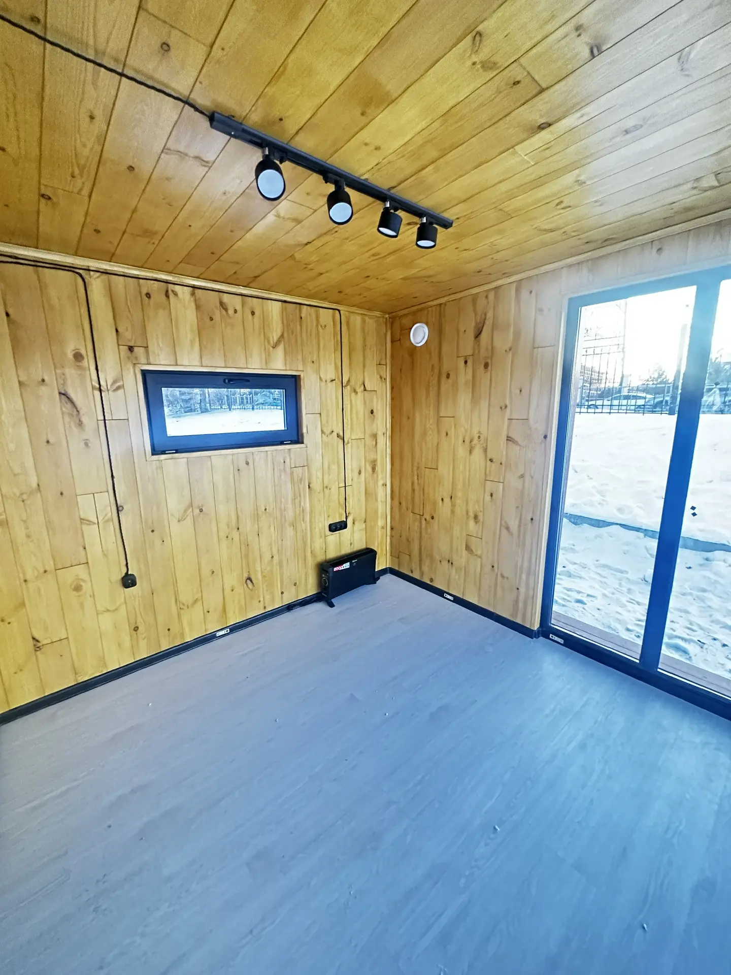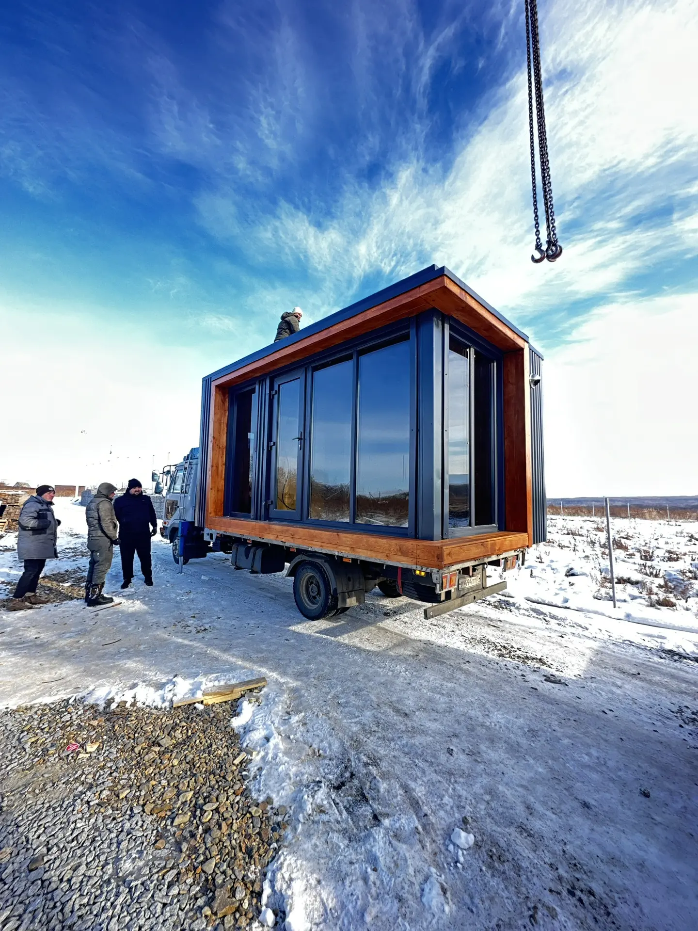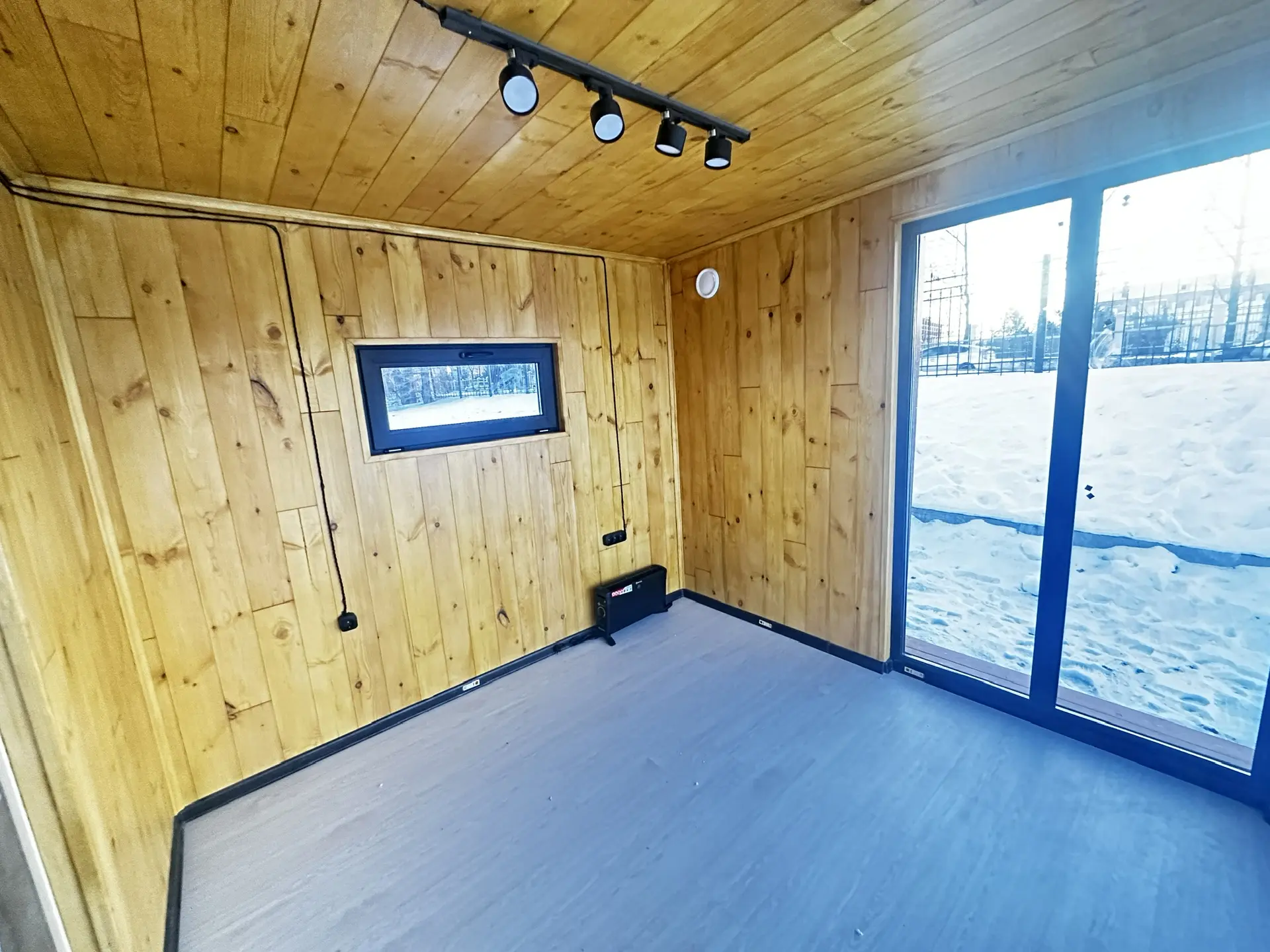 Каркас из металла и утепление 100 мм базальтовой плитой обеспечивают отличное удержание тепла и долговечность конструкции. Большие панорамные окна создают ощущение простора и соединяют вас с природой — особенно эффектно смотрится в лесу, у реки или на участке с красивым видом.